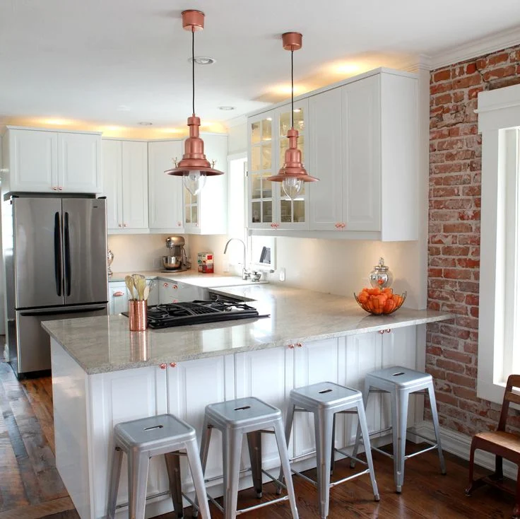 Using open shelving allows for more space to showcase the exposed brick. A small wall above cabinets can be a great space to test out the brick look.