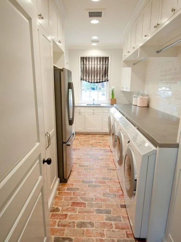 Exposed brick is also a great option for floors! These floors pop when paired with white cabinets in this gorgeous laundry room.